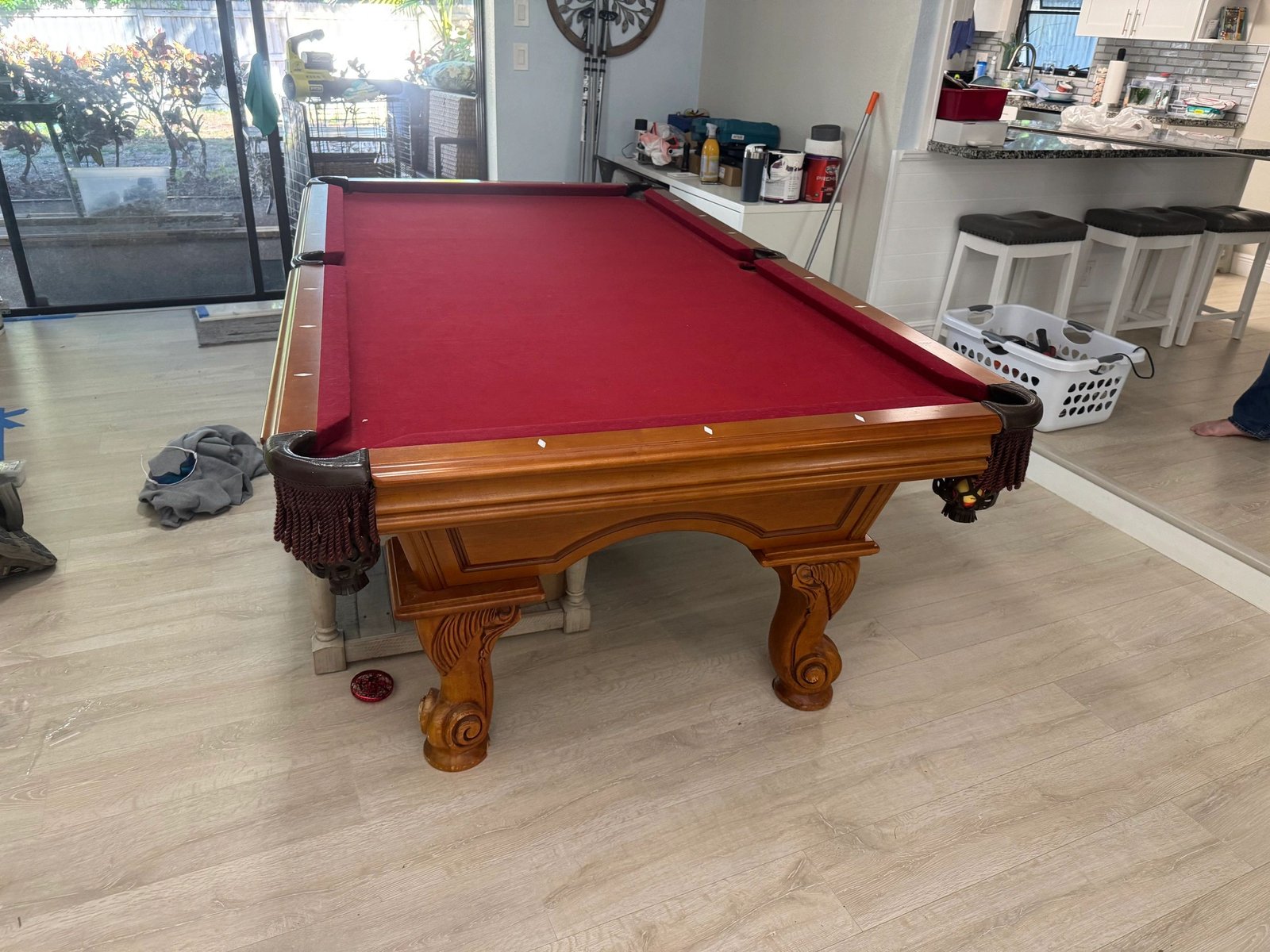 Classic 4×8 pool table with brand new felt. Solid construction, great playing surface. Includes free delivery and professional setup in the Tampa Bay area. Ready to play!